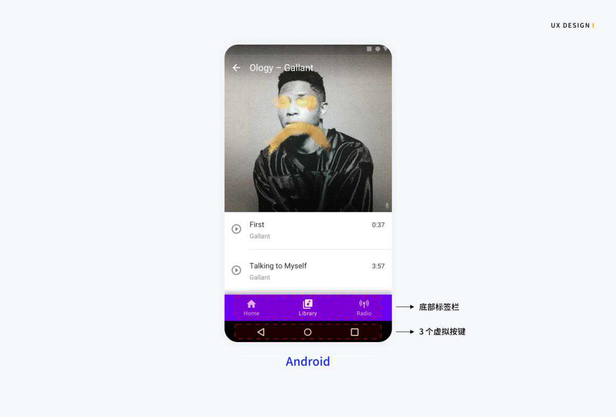 而在设计规范中,为了避免底部标签栏与已经存在的底部虚拟键产生交互上的冲突,安卓明确说明了不要使用底部标签栏。