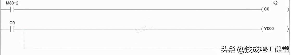 结合这些内部时钟和计数器,可以实现闪烁电路的设计等,如下图25-2所示为0.2s闪烁电路梯形图。