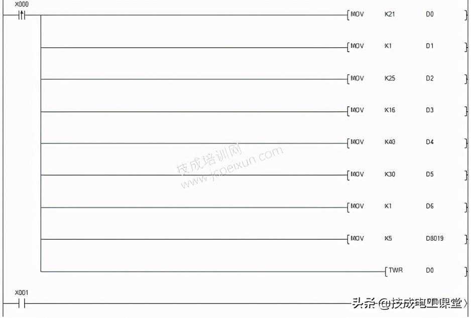 例如图25-6所示的梯形图,当X0接通,指令将PLC中D8013~D8019的数据传送到D0~D6中。