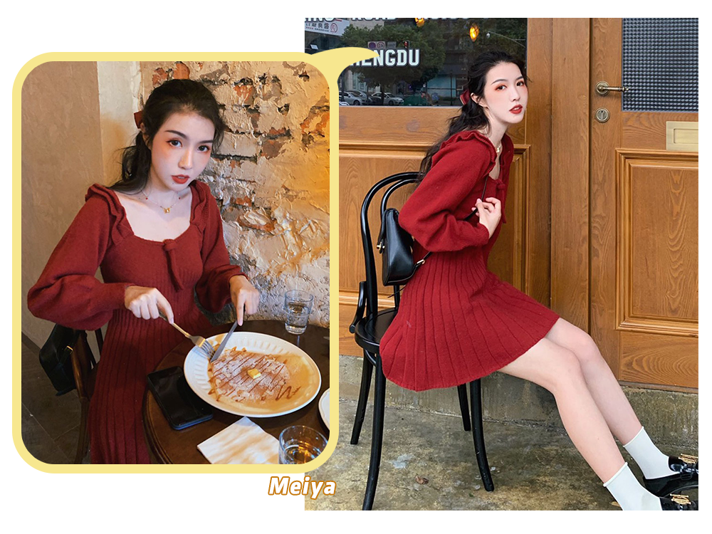 红色针织连衣裙女收腰显瘦