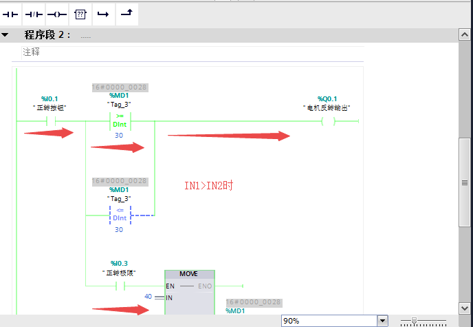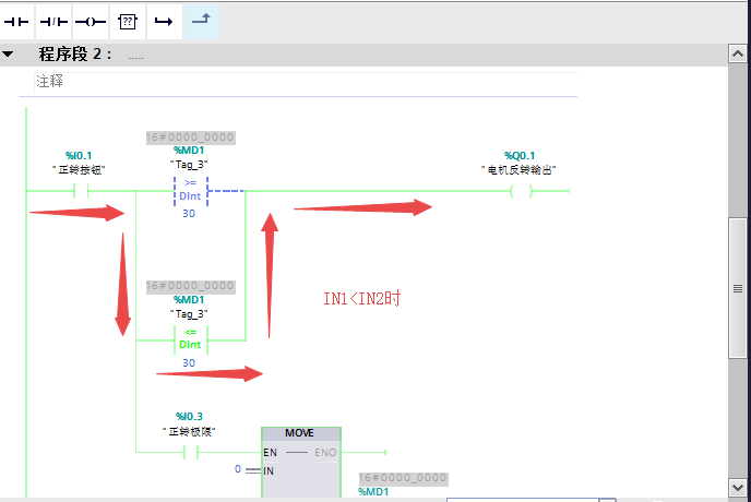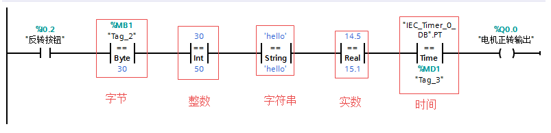 比较指令:用于比较数据的大小,按照所比较的数据类型不同可分为整数比较、双精度整数比较、实数比较三种类型,将IN1和IN2的数据进行比较,比较时必须保证两个数的数据类型相同,数据类型可以是整数、长整数和实数。