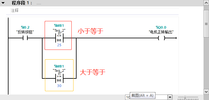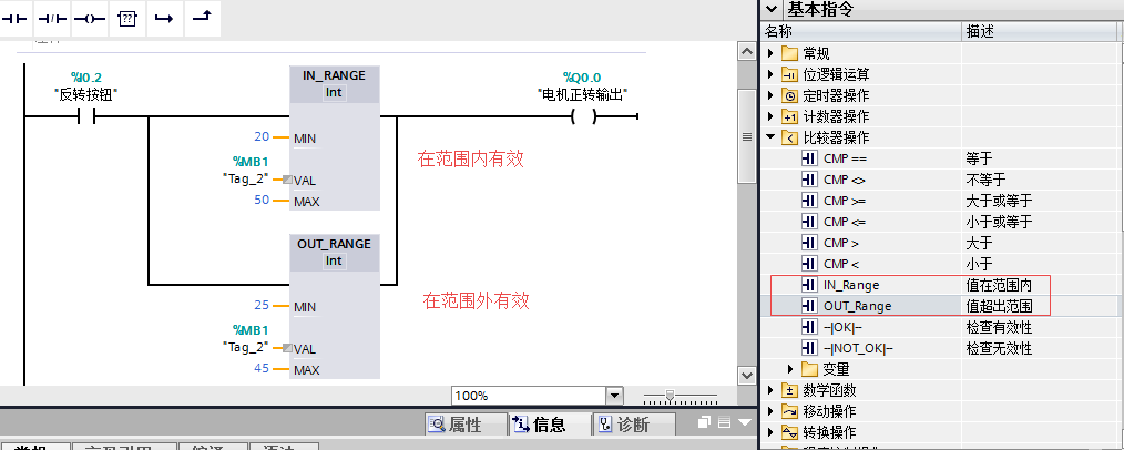 IN_RANGE指令:使用输入MIN和MAX可以指定取值范围的限值。“值在范围内”指令将输入VAL的值与输入MIN和MAX的值进行比较,并将结果发送到功能框输出中。如果输入VAL的值满足MIN=VAL或VAL=MAX的比较条件,则功能框输出的信号状态为“1”。如果不满足比较条件,则功能框输出的信号状态为“0”。