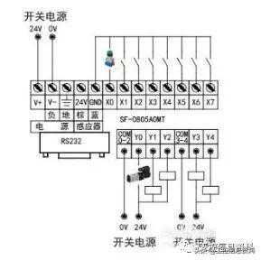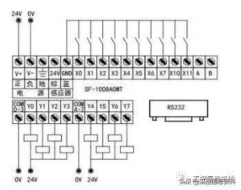 简思PLC输出端为:COM端和Y端,COM端接0V,Y端为输出控制端。简思PLC可直接驱动DC24V的气缸电磁阀,输出端6W以内可直接控制,功率高的负载,即功率》6W的负载,PLC不能直接驱动,需要用DC24V的中间继电器转接。