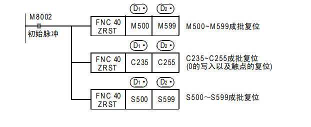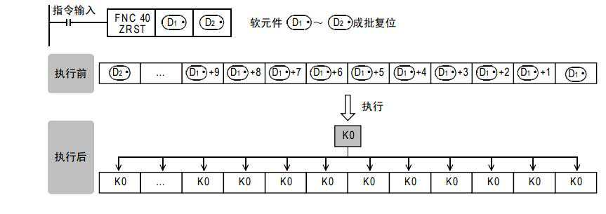 将同一种类的D1~D2全部复位。D1,D2为位软元件时D1~D2的软元件范围全部被写入OFF(复位)。