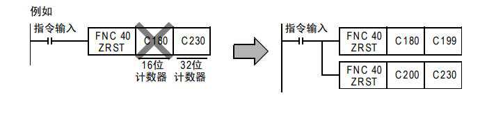 2.关于高速计数器(C235~C255)的指定ZRST指令作为16位处理的指令,但也可以在D1,D2中指定32位计数器。但是,指定时不允许出现类似D1中指定16位计数器,D2中指定32位计数器的混在的情况。