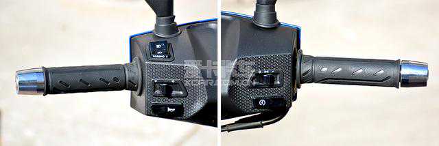 操控把按键排列简洁有序,左侧手把控制分别由远近光/超车灯组合按键、转向灯按键,以及喇叭按键组成,右侧手把控制由灯光控制按键和发动机启动按键组成。
