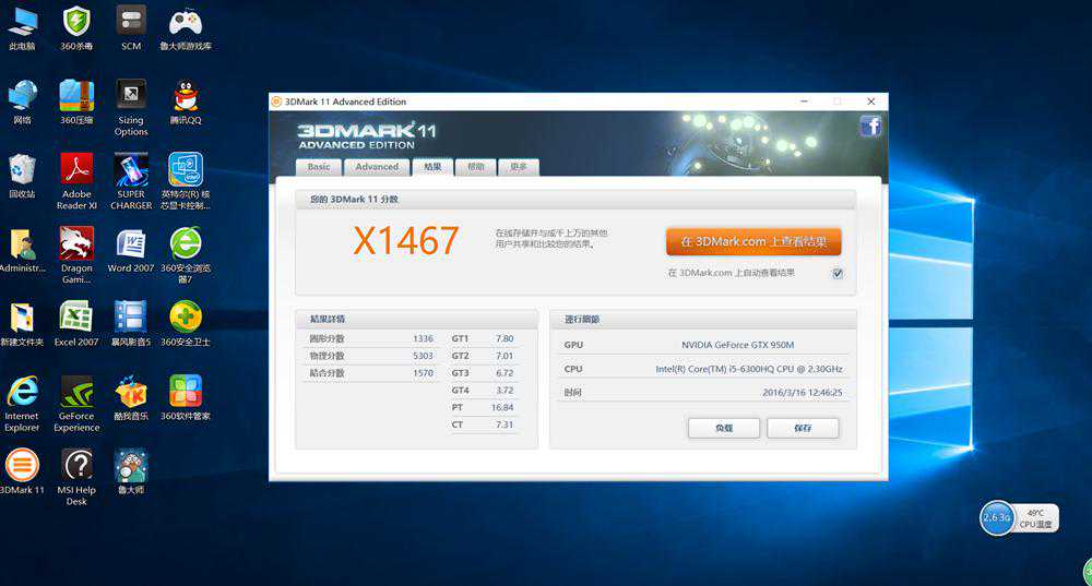 测试分别用P模式和X模式进行了两次,其中P模式分数为4676,而X分为1467。可以看出“小龙”GL62所搭载的NVIDAGeForceGTX950M中端独显还是相当给力的。