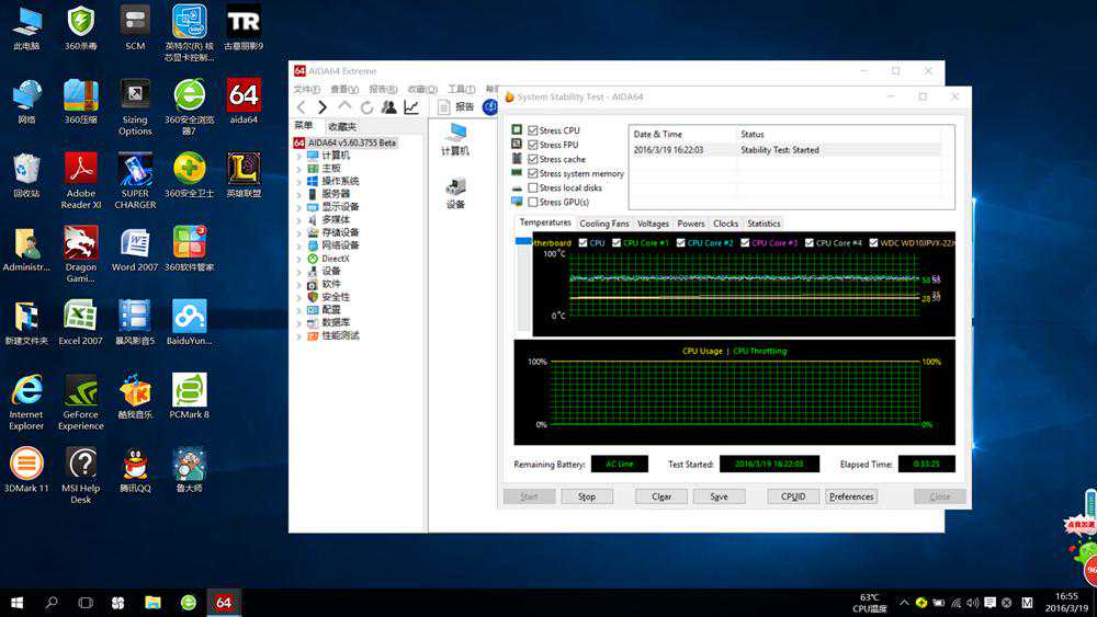 前面提到“小龙”在散热方面的优化努力,实际情况我们通过AIDA64对这台游戏本进行30分钟的烤机测试,从数据来看,处理器的温度基本维持在60度上下,这样的散热成绩,即使在游戏本里应该来说也是非常出色的。这也能够看出,微星在散热方面拥有着先机的处理方式。