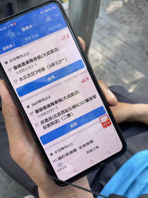 小李:像以前跑众包,乐意跑远的就跑远的,乐意跑近的就跑近的,平台会给派远单,然后自己选择。现在不是这样了,现在是就近,基本上就只跑丰台这块。你看这个2.1、3.2、1.6,都是两三公里之内,最远也就4公里左右,基本上就是在一个熟悉的范围内跑。我就跑这几个美食城,然后这附近几个小区。