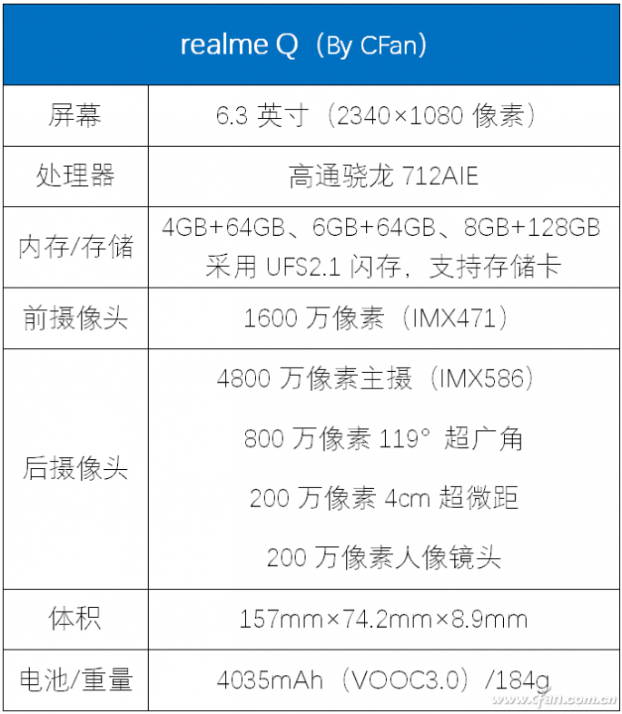 而realmeQ就是realme品牌刚刚在国内发布的全新成员,它在配置方面较realmeX有了进一步提升,但起价却比realmeX青春版还要便宜,在不足千元的价位里就带来了骁龙712、闪存、由IMX586领衔的AI四摄以及闪充功能,性能价格比可以秒杀一众同价位的竞品,较之很多1500+的中端价位悍将也是不逞多让。