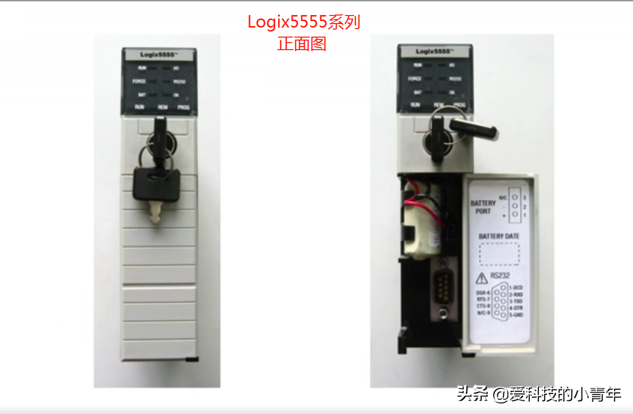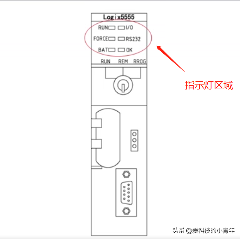 自带显示设备状态的一些指示灯,如下图,Logix5555的CPU,包含多个指示灯,具体功能如下,