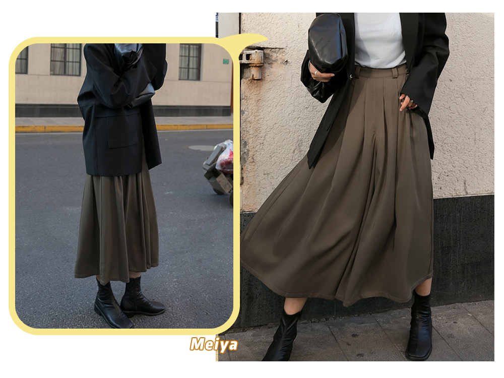 对于芽芽来说,百褶半裙是最经典的款式之一,给人一种慵懒柔美的感觉。尤其是和西装衬衫相搭配,半裙的垂坠感平衡上衣的硬朗,带有一种流动的美感。