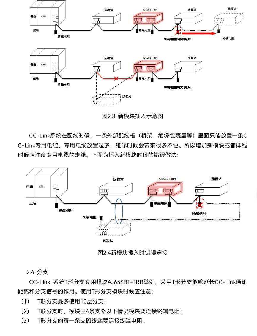 1.电源配线CC-Link系统中电源主要有主站基板电源,从站使用的基板电源、信号使用的24V电源、CC-Link远程站模块使用的24V模块电源和外部设备使用的电源等。其中主站、从站使用的基板电源根据所选电源实际情况使用,外部设备的电源使用根据设备的配置实际情况考虑。信号和CC-Link系统远程站模块使用的电源在使用的时候要注意,以下进行介绍。1.1电源使用规范在同一个CC-Link系统中,从主站开始到终端所有的模块电源要使用相同24V电源。在选择电源时要考虑电压降,功率,电流等因素。对于远程I/O模块,模块有两个电源,一个是模块电源,一个是外部信号电源。为避免信号发生错乱,维修的便利所有的CC-Link模块使用同一个24V直流电源。