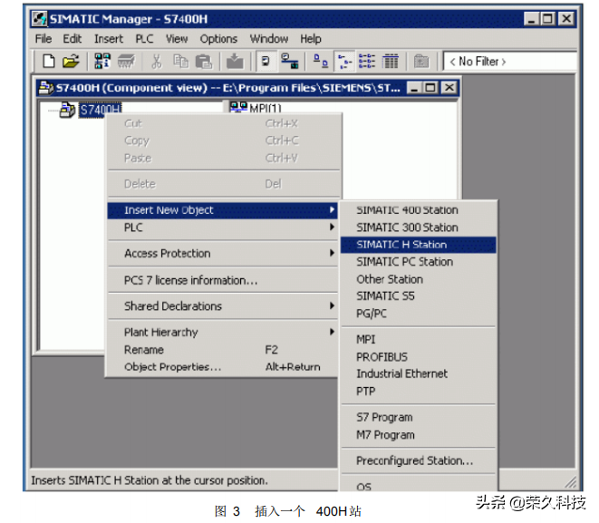 1.首先双击“SIMATICManager”图标,打开SIMATICManager并新建一个S7-400H的单项目,在项目中插入一个“SIMATICHStation”,插入结束,左侧树形目录下会出现一个“SIMATICHStation(1)”,操作(如图3)所显示。