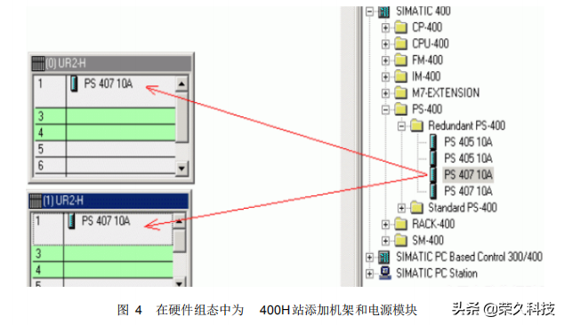 分别在两个机架中添加PS407电源模块,路径为:SIMATIC400PS-400PS40710A(6ES7407-0KR02-0AA0)。