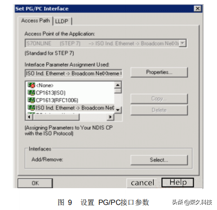 打开“SIAMATICManager”“Options”“SetPG/PCInterface,”可以将PG/PC接口设置成ISOIndEthernet方式。如果使用的电脑安装了1613网卡,可以将PG/PC接口设置为1613的ISO通讯方式,如果使用的电脑中只装有普通的网卡,就选择普通网卡的ISO的通讯方式,如下图:本实验中选择的是Broadcom的普通以太网卡连接作为PG/PC物理通讯接口(如图9)。