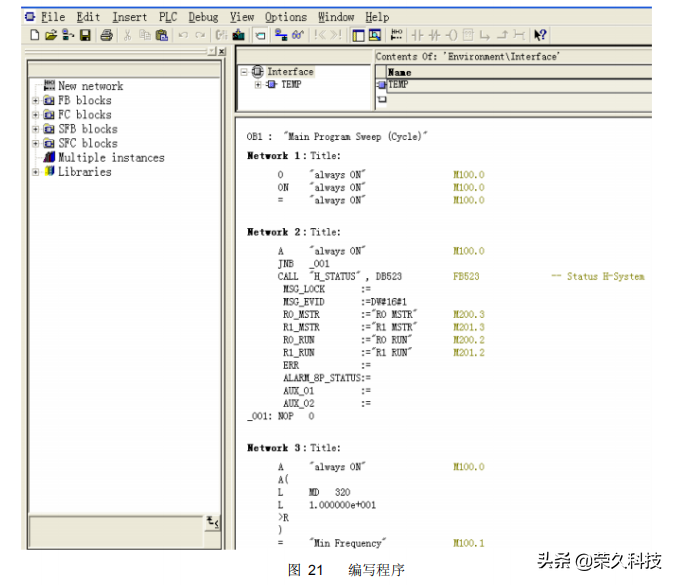 2.3新建示例项目组态结束,打开OB1块LAD/STL/FBD编程界面进行控制程序编辑(如图21)