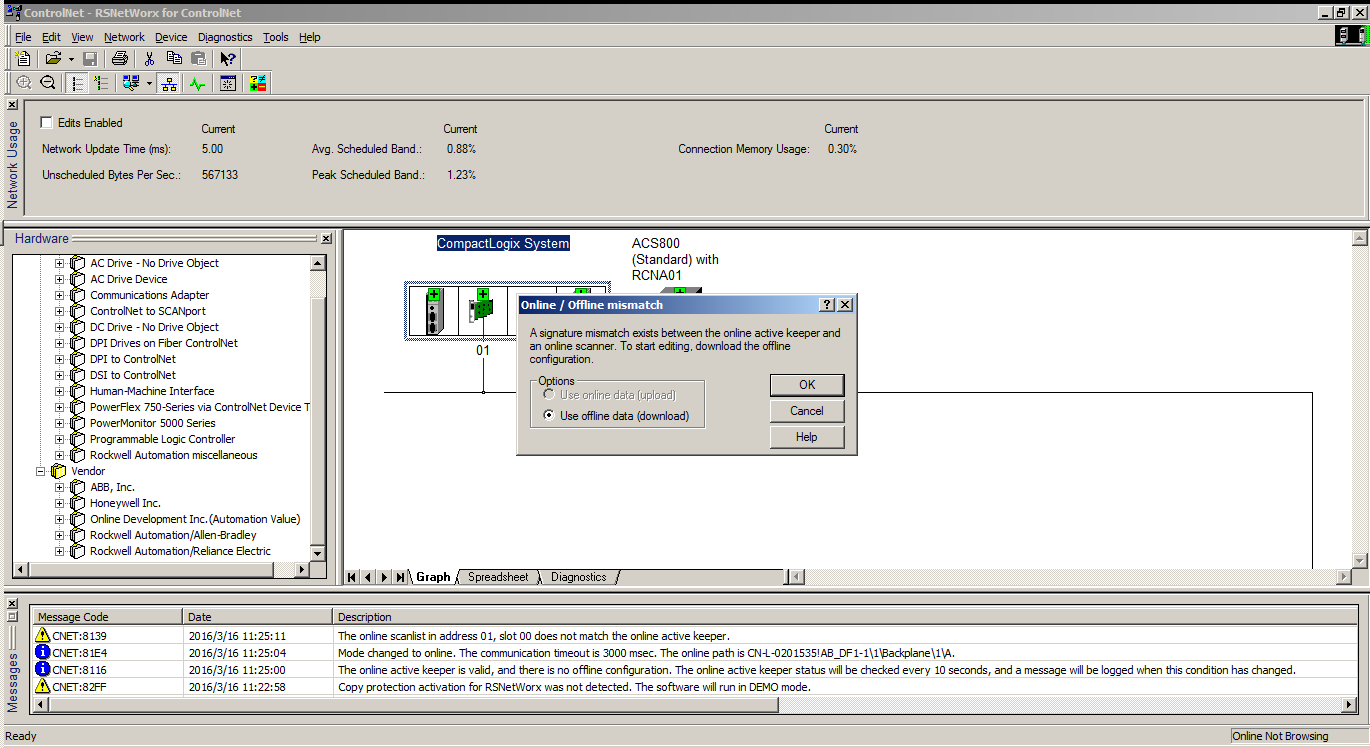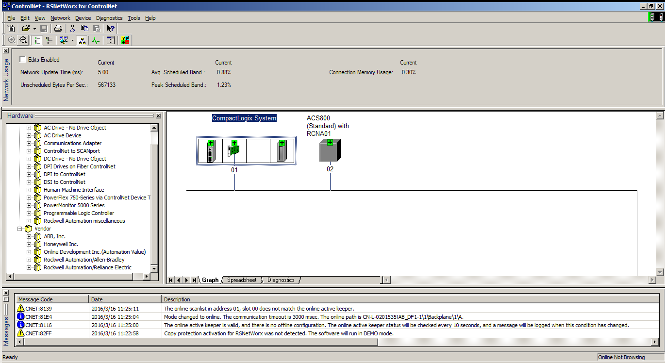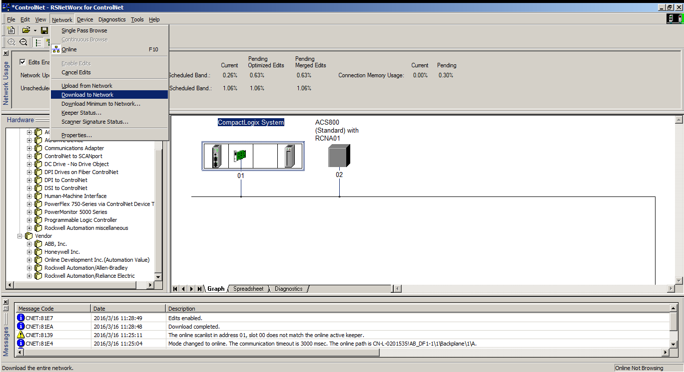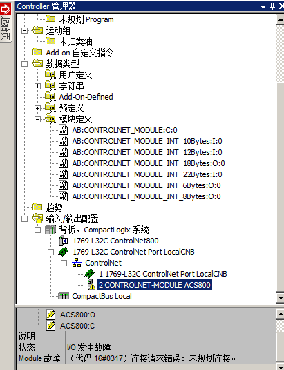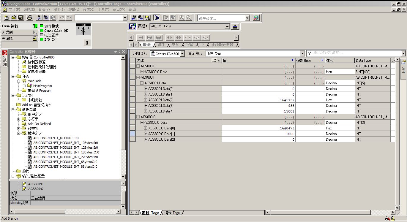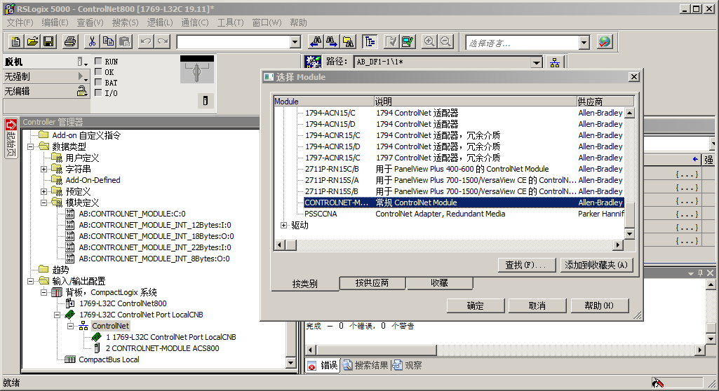 使用的硬件:ACS800/550/510变频器+RCNA-01模块,ABCompactLogixPLC+RSLogix5000+RSNetWorx组态软件