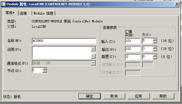 c.添加成功后,再弹出的对话框中填入相应信息,节点号与要通讯的变频器设置一致,名称任意,输入与输出实例号对应于变频器51.06和51.07的设置,输入输出的大小与51.26设置一致,但要注意输入的大小要在实际基础上加2;