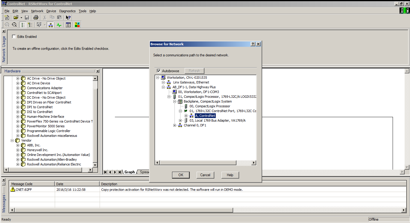 f.等待扫描完成后,ControlNet网络中的设备应该能被正常识别,新设备上面有绿色的加号;