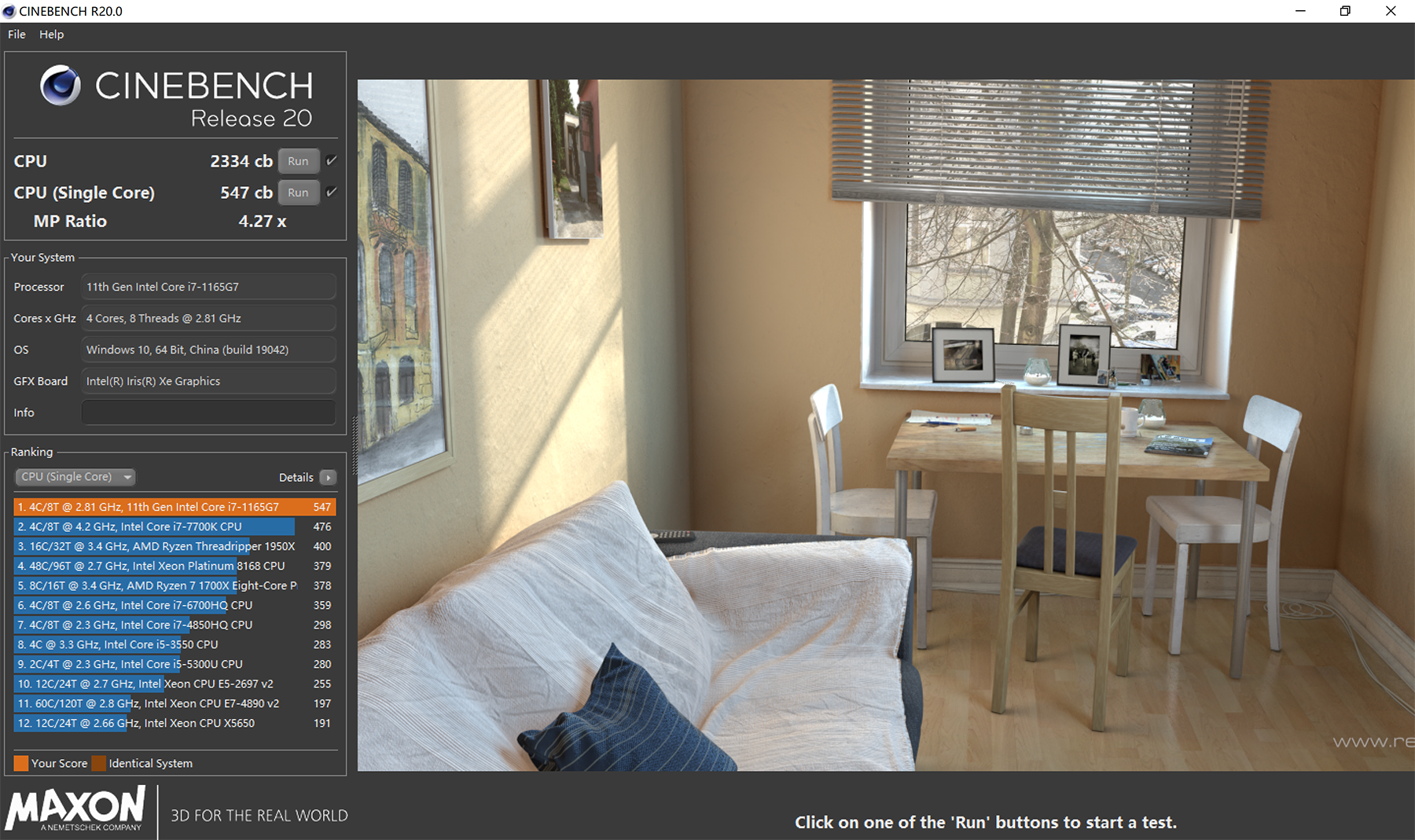按照惯例我们用CINBENCHR20对Unis14T的CPU性能做了跑分测试。实测它的单核成绩为547cb,多核2334cb。