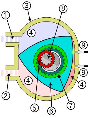转子(rotor):作用相当于往复式活塞发动机的活塞和连杆,断面为勒洛三角形,侧面的凹槽(combustioncavity)尺寸攸关发动机压缩比。根据回旋的位置,进、排气埠会随着关闭或打开,因此也具有排气门的功能。