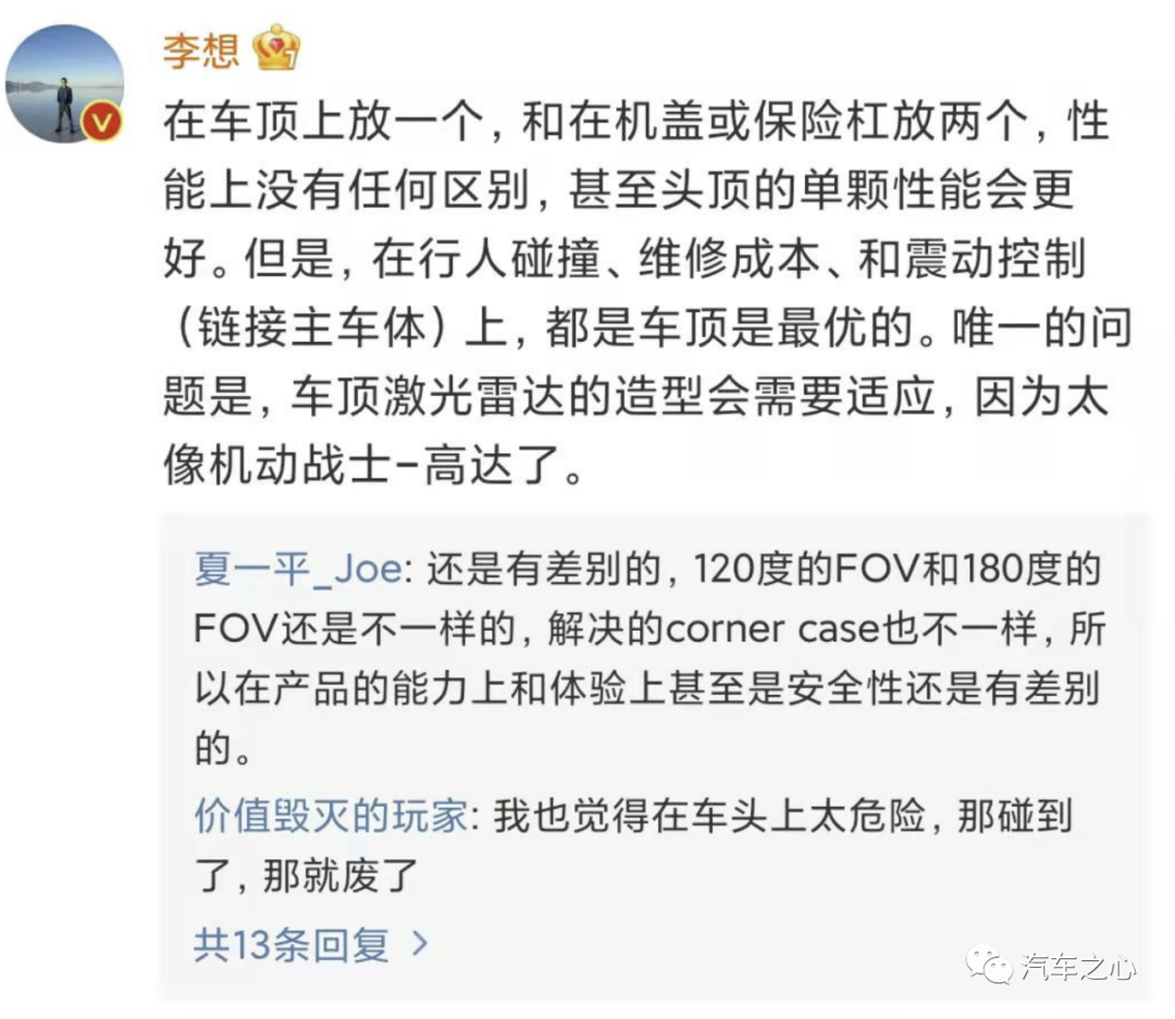 照片公开后,引来了理想汽车CEO李想的围观,李想认为车顶布置激光雷达才是最优解,而集度汽车CEO夏一平则认为,激光雷达在车顶布置和两侧布置所解决的问题、产品能力和安全性都有所差别。