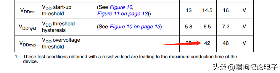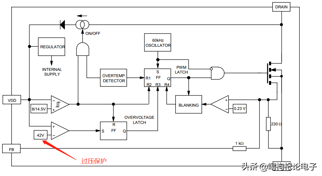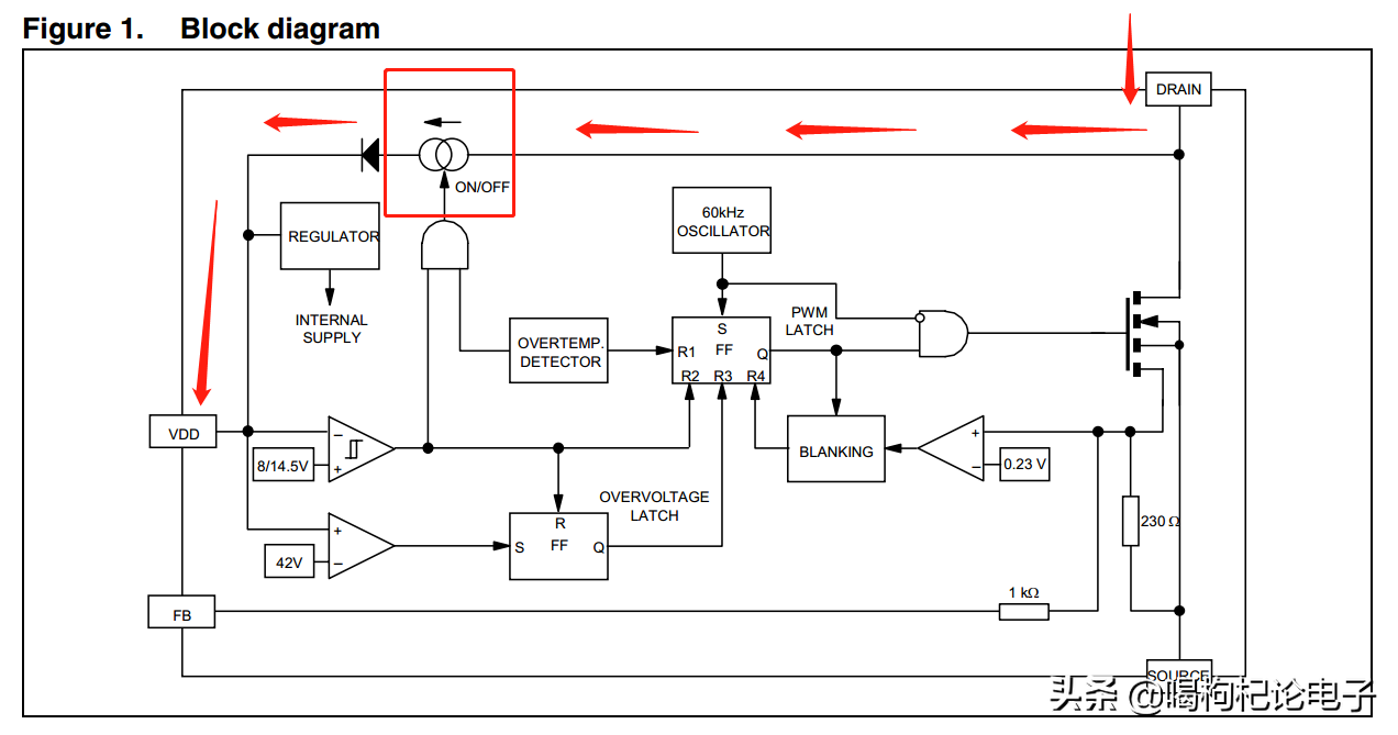 VDD:控制电路的供电电源,VIPER22A没有外部启动电阻,精简了电路。启动时漏极的高压进入芯片,然后芯片内部高压电流源开关打开,对VDD电容进行充电(下图1),当达到启动电压时,内部高压启动电路关闭。内部迟滞比较器监测VDD电压,并提供两个阈值,VDDon和VDDoff(下图2).VDDon值为14.5V,当VDD电压达到14.5V,此时高压电流源开关断开,关闭启动电流源,电源启动后VDD电容的能量将由变压器提供,VDDoff电压为8V.当VDD电压降到8V,此时高压电流源开关打开,由高压电流源对VDD电容充电。此处为何要设两个阈值?试想一下,如果只设定一个启动值VDDon的话,电源能启动吗?举例说明,当VDD电容充到14.5V时,芯片启动,内部振荡器等电路开始工作,这些模块工作是要消耗电流的,也就是说,当电源刚刚启动起来,因为内部模块的消耗,VDD电容会立即跌落到14.5V以下,芯片会停止启动,接着高压电流源继续对DD电容充电,充到14.5V时芯片又开始工作,周而复始,芯片始终处于启动--停止--启动的循环状态,一直到天荒地老,芯片将不能正常启动。这是设定VDDoff阈值的好处就体现出来了,设定了VDDoff阈值后,就会形成一个回差,差值为6.5V.由于这个差值的存在,在VDD电压跌落到8V以前,芯片已经正常启动完成了,芯片启动完成后,将由变压器辅助绕组源源不断的提供电流给VDD电容,这时电源启动完成。