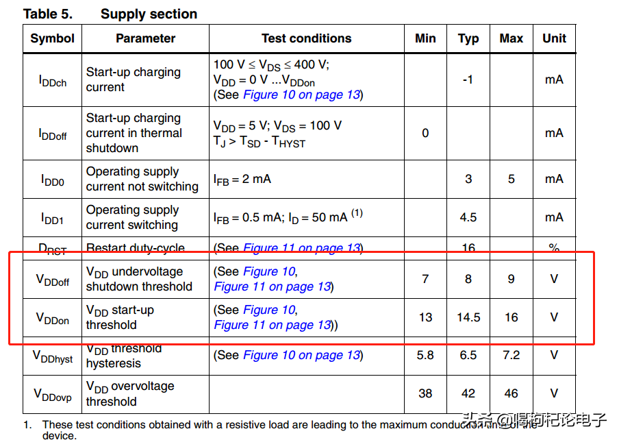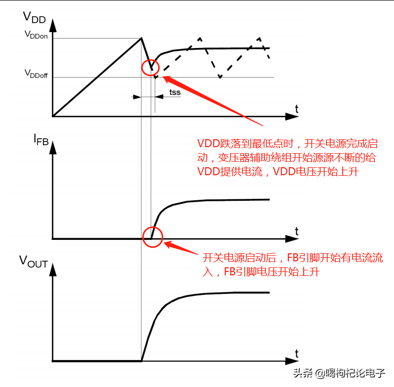 上图中最上面虚线部分表示的是,电源启动失败的波形,如果在VDD上的电压跌落到VDDoff以前,电源还没有启动完成,也就是说VDD上的电容上的能量因为芯片内部模块的启动一直在消耗能量,直到电压跌落到VDDoff.电源还没有启动完成,辅助绕组还未提供能量给VDD电容,电源将启动失败,虚线的波形就是VDD电容在一直充电放电的过程。