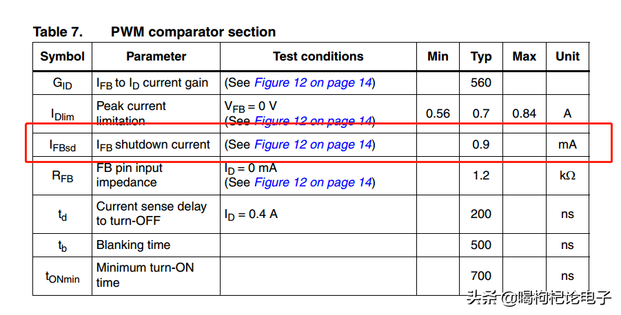 IFBsd的值由内部的PWM比较器所决定的,实际上当漏极电流ID大约等于IDlim的12%时(下图9),也就是约85mA时,芯片进入burstmode模式,改善轻载下的待机功耗。见下图10