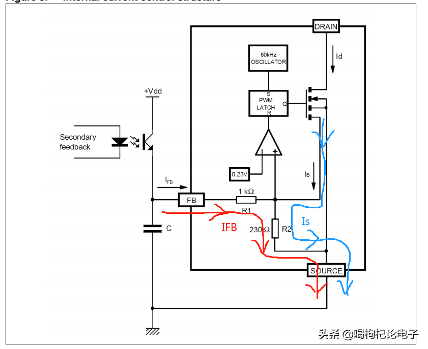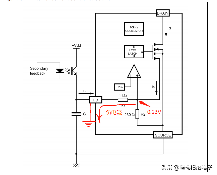 根据上式R2(Is+IFB),可以轻松的推导出Is=(0.23V/R2)-为功率MOS上Is和Id的映射比例关系函数(如图5),可得出Id=Gid*Is=Gid[(0.23V/R2)-IFB].当将FB引脚接地时将得到最大的Id值即IDlim.此时FB脚将流过1个负方向的电流(下图6),IFB=-(0.23V/R1).MOS漏极最大值IDlim=Gid*0.23V*(R1+R2)/(R1*R2)