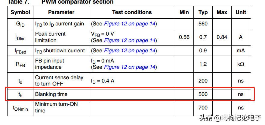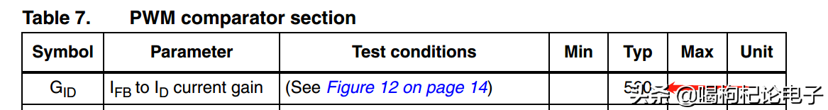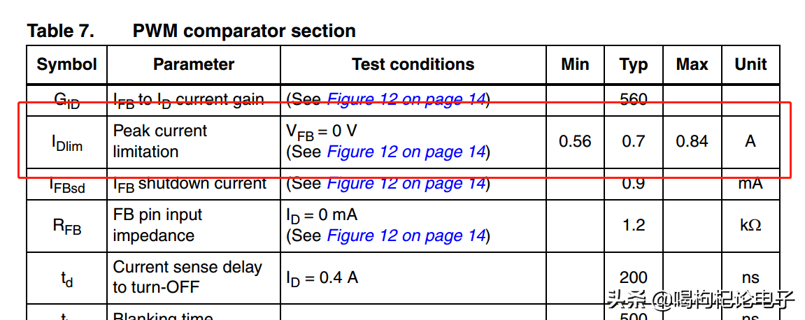 在实际应用中,FB引脚往往是被1个外部光耦驱动的,光耦的C极上拉的电源,所以在这种应用场合下,FB脚并不能真正的短接到地,所以上式最大的IDlim是不可能达到的。然而,图中FB脚并联有稳定FB引脚电压的电容C,当光耦关断时(电源刚启动时或电源次级短路时),因此我们可以假定此时FB脚的电压非常接近为零。