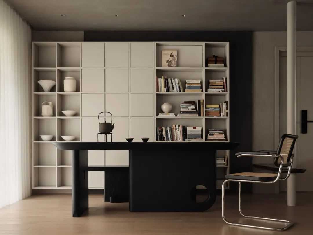 首先,我将原本邻近客厅的次卧室墙体进行了全面拆除,从而得到了一个较为宽大的横厅。正因如此,我才有了条件,将客厅前移,使其成为整个空间的中心部分。同时,前移后的客厅也为新的就餐区域提供了较为舒适的空间尺度,以此满足了书柜与条形餐桌的安放。因为餐厅区位的重新规划,所以原餐厅空间得以被释放,为我的西厨空间创造了合理的条件。这无疑是为原本局促的厨房空间进行了从容且有力的补充。