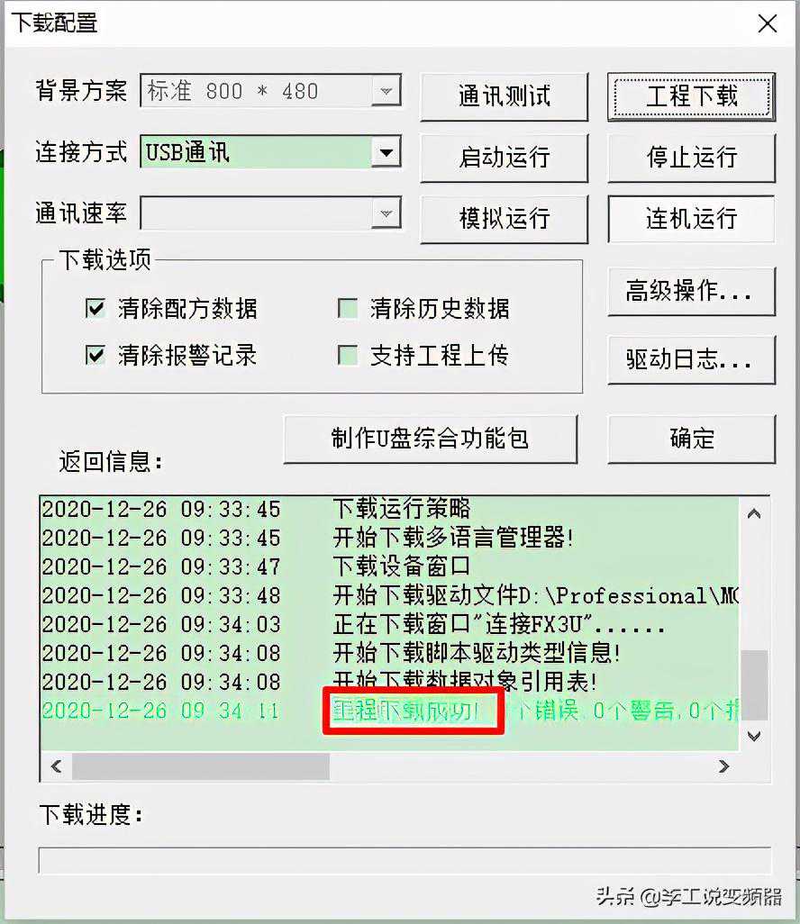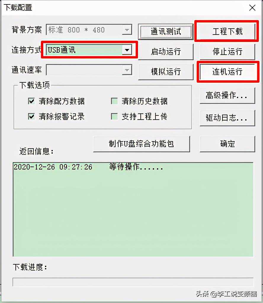 2.连接方式选择“USB通讯”,再点“连机运行”,再点“工程下载”