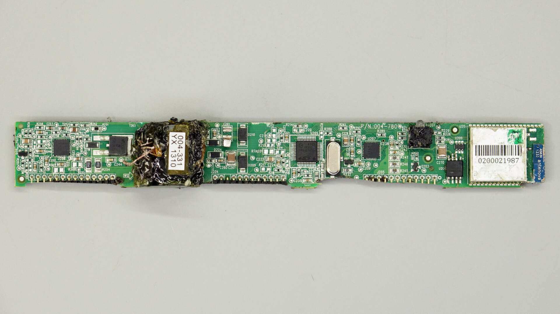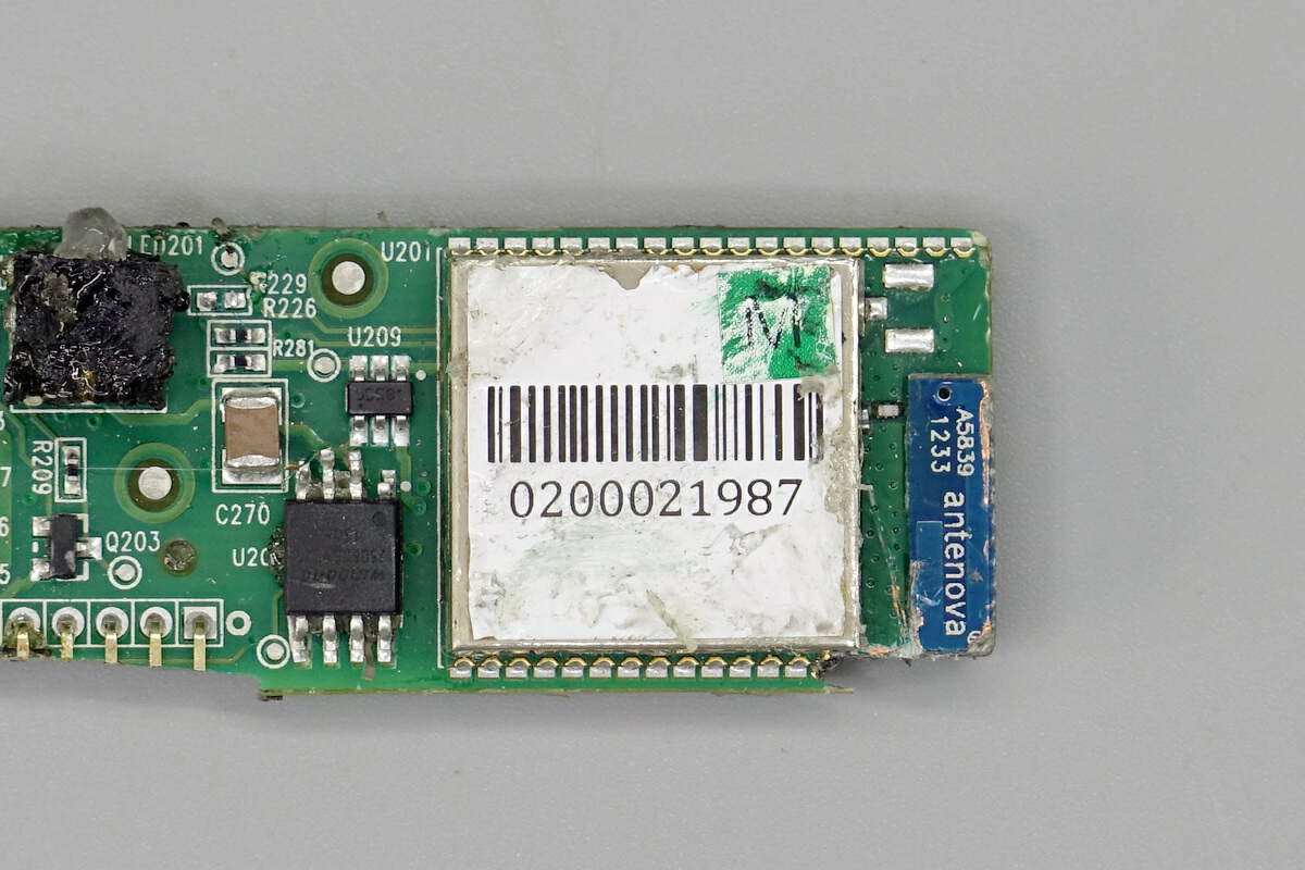 撕下橡胶外壳,内部PCBA模块采用铝合金外壳屏蔽保护,并通过螺丝固定。