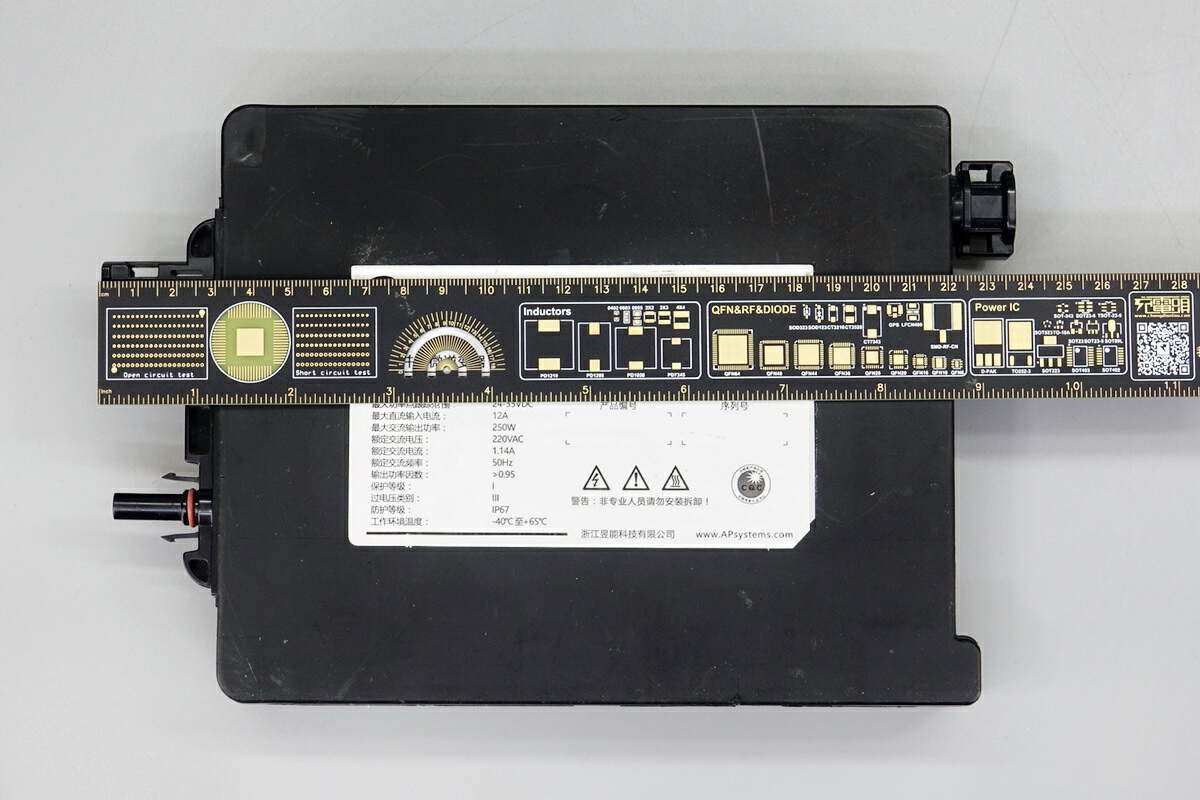 这是充电头网淘回来的昱能科技又一款产品,机身外壳为橡胶材质,通体黑色还有点脏,尽显沧桑感。顶面贴有APsystems昱能科技品牌贴纸。