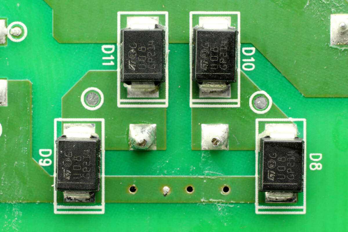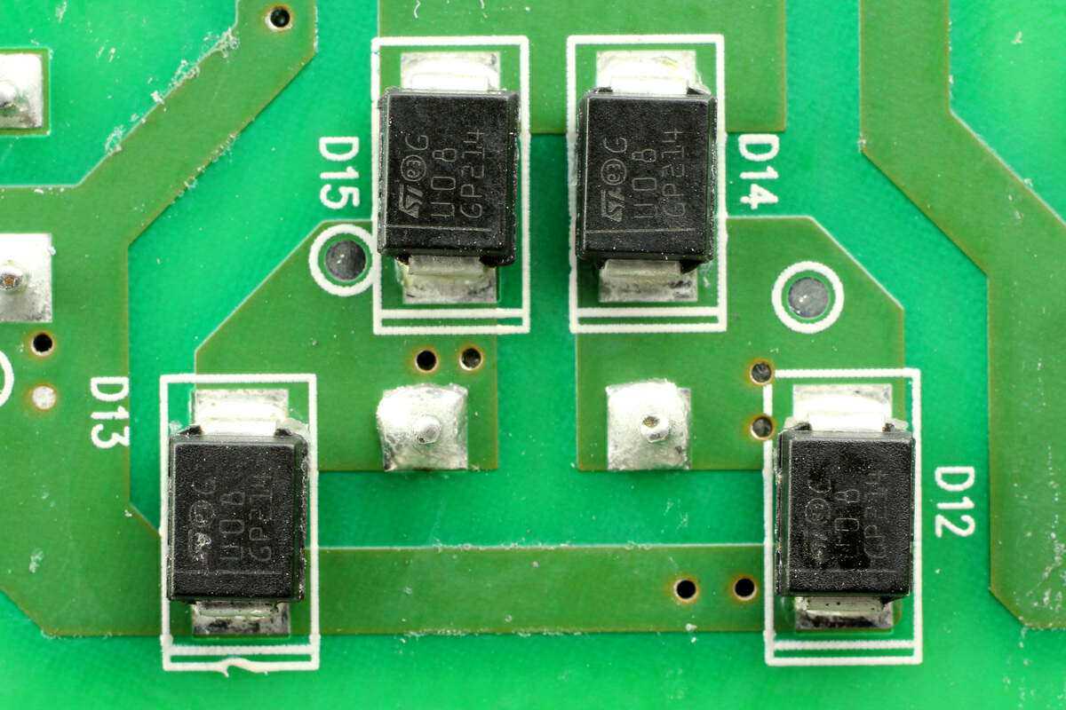 整流二极管来自ST意法半导体,丝印U08,实际型号为STTH208U,是一颗2A800V的超快恢复二极管,采用SMB封装,用于升压输出桥式整流。