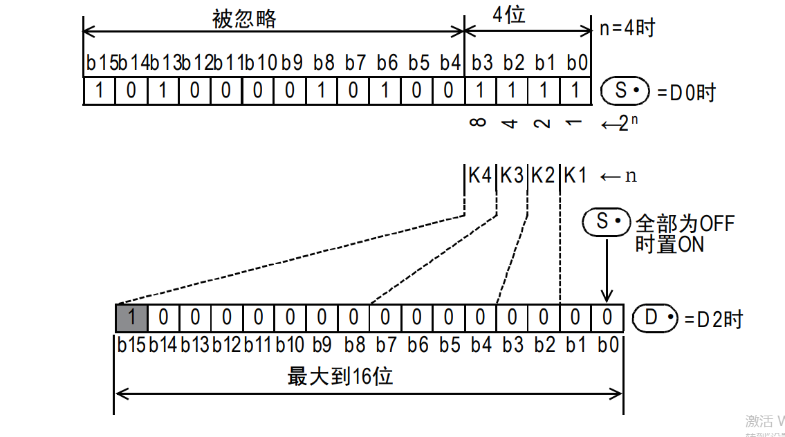 举例说明:DECOX0M0K2;X0和X1这2个位可以组合成4个状态,每一种状态分别对应M0,M1,M2,M3,根据X0和X1的不同状态,分别单独置位M0-M3这四个位寄存器。比如X0=1,