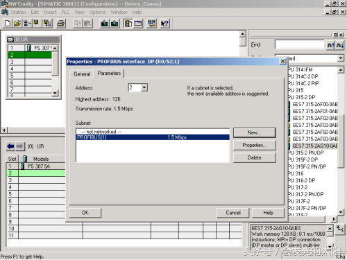 接下来对该站进行硬件组态:从硬件组态目录中依次插入机架、电源、CPU,设置CPU上PROFIBUSDP接口的网络参数(可采用缺省设置,即:地址2,最高地址126,波特率1.5Mbps,协议DP)。如图4所示。