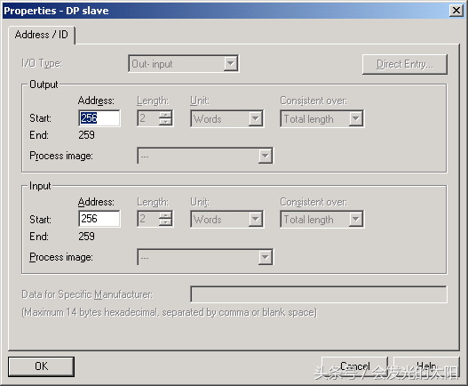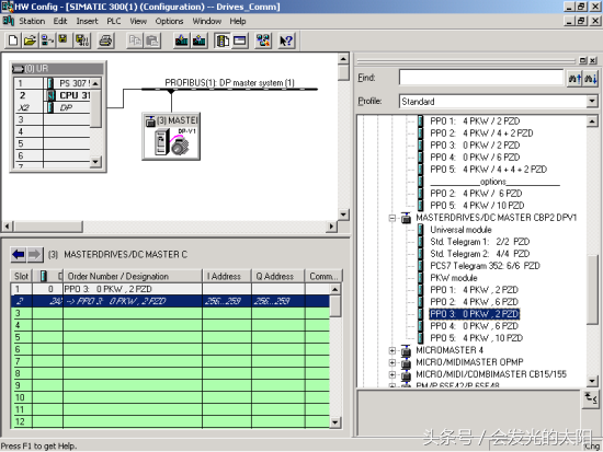 将右边窗口硬件目录中MASTERDRIVES/DCMASTERCBP2DPV1下面的PPO3:0PKW,2PZD插入左下窗口中的第一行(Slot1)。该选项共占两行。意思是:PPO类型3,即:0个字参数数据(又叫PKW),2个字过程数据(又叫PZD)。参数数据用于PLC读/写变频器的参数,过程数据用于PLC控制和监视生产过程。0个字参数数据表示PLC不能读/写驱动装置的参数,参数数据也不占用S7的外设地址;2个字过程数据表示PLC和驱动装置交换2个字过程数据,各占用S7-300PLC四个字节的外设地址。地址范围是输入字节256-259,输出字节256-259。如图7所示。