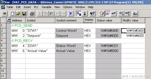 通常S7传送到驱动装置的第1个字是控制字,第2个字是频率设定值;驱动装置传送到S7的第1个字是状态字,第2个字是频率实际值。这是最简单的应用。