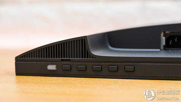 底部左侧则是按键区域,从左至右分别是电源键以及功能键,其上的栅栏处是预留的扬声器开孔。明基PD2700U搭载了两个2W扬声器,组成了双声道,可惜功率不大,嘈杂环境下可能会有影响。