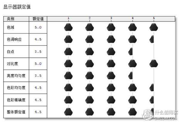 红蜘蛛五代给明基PD2700U的评分上面,色域、对比度表现最佳(5分);色调响应、色彩精准度表现次之(4.5分);其次是白点、亮度均匀度(3.5分);最后的整体得分为4.5分。