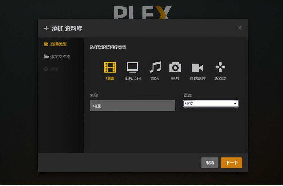 这里需要注意,需要选择文件夹的类型,根据您的情况看看是选择电影?电视节目?音乐?还是其他。其次,语言选择中文。