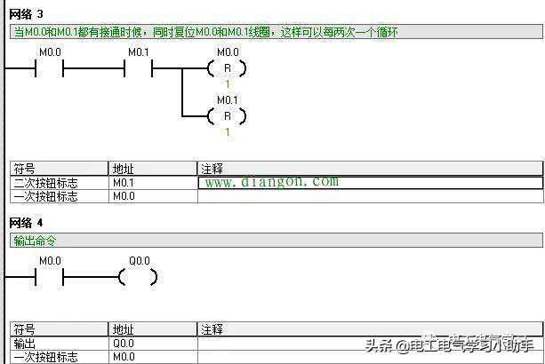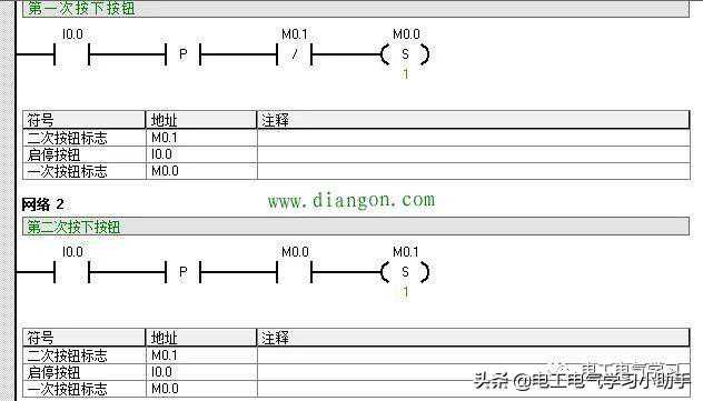 当第一次按下按钮时候,网络1置位就导通了,网络2和网络3中常开点闭合,同时网络四接通,同样,当第二次按下按钮时候,网络2的导通,同时网络3和导通,复位和线圈。大家有机会自己编写好程序,自己链接上PLC就可以去试一试。当然西门子还有其他方法可以实现,那就是用计数器指令,也可以实现一键启停。我就在里过多废话了。