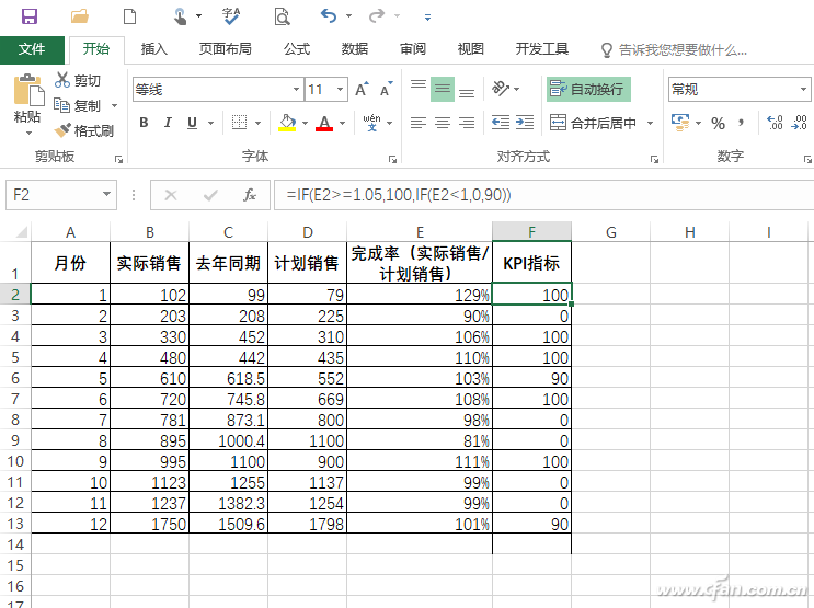 然后在Excel中,借助IF函数来完成KPI标记,定位到F2单元格,输入公式“=IF(E2=1.05,100,IF(E21,0,90))”,这样即可在KPI指标处显示对应的数字标记(图2)。
