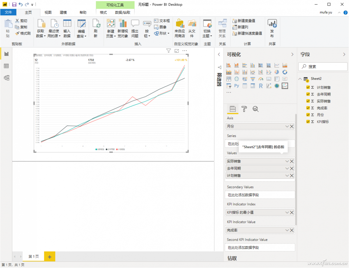 接着按提示依次将右侧窗格的字段列表“月份”拖到可视化下的“Aris”字段下方,将“计划销售”、“实际销售”、“去年同期”拖到“Values”字段下方,这样即可快速生成三个销售数据的折线报表了。通过折线比较可以很清楚地看到每个月销售的完成情况,比如6月份实际销售(蓝色线)在计划销售(红色线)上,表示销售超过计划数字(图5)。