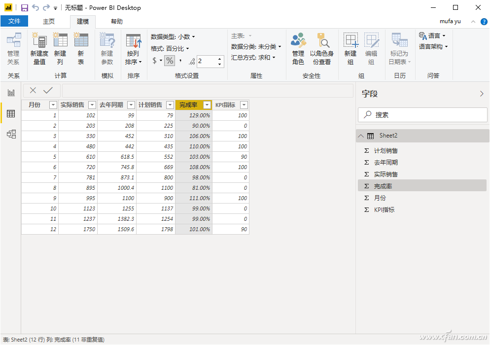 在左侧面板中切换到“数据”,选中“完成率”,将其数据类型和格式分别设置为“小数”和“百分比”,同上选中“KPI指标”,数据类型和格式设置为“整数”(图6)。