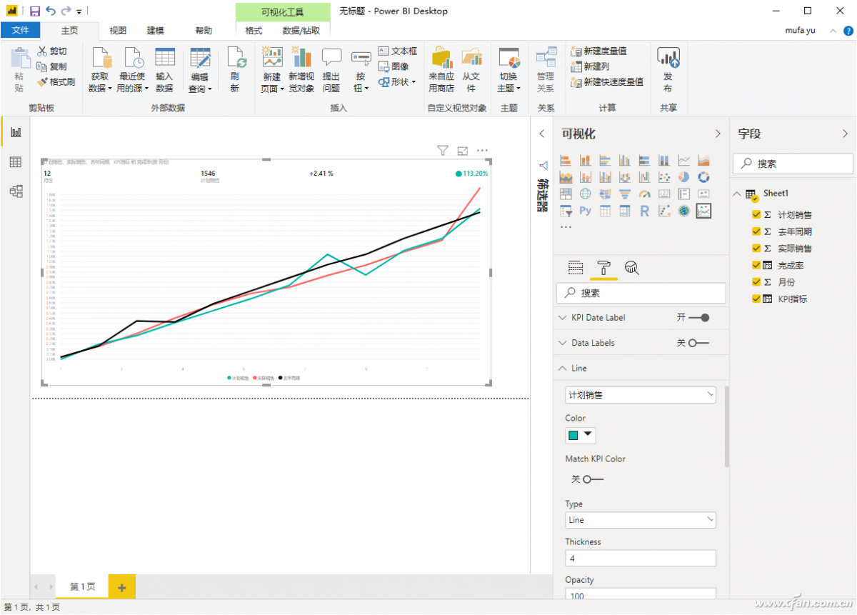 我们可以根据自己的实际需要对报表进行美化,比如可以将三个销售数据的折现颜色进行区分。切换到右侧面板可视化下方的“格式”,找到“Line”选项并展开,依次将“计划销售”设置为蓝色,“去年销售”设置为“黑色”,“实际销售”设置为“红色”,其他还可以对线条大小、样式等进行设置。这样通过颜色就可以很方便地看到每月份三个数据的比较了(图8)。