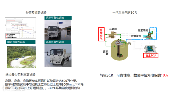 肯定会有人质疑,新产品的质量能好吗?在产品质量方面大柴经过了严格的试验,搭载新4DD的整车经历了高寒、高温、高海拔的恶劣环境试验,累计试验达500万公里。同时与其搭载的气驱SCR也提高了可靠性,故障率仅为电驱的10%(PS:气驱SCR为一汽独有专利,成本低、结构简单、故障率低)。经严格试验验证后,整机寿命可达80万公里以上,故障率相比同级别产品低20%。